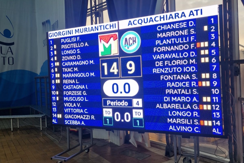 Nell'incontro valevole per la sesta giornata del girone Sud del campionato di serie A2 l'Acquachiara perde 14-9 alla piscina Comunale di Nesima contro la Giorgini Ottica Muri Antichi. I biancoazzurri approcciano bene il match, reagiscono all'1-0 di Marangolo con i sigilli apposti da Varavallo e Di Maro e chiudono il parziale di apertura sul 3-3.