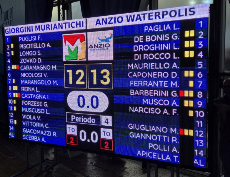 Il nuovo anno inizia com’era finito il precedente per la Giorgini Ottica Muri Antichi che incappa in un’amara sconfitta contro Anzio Waterpolis brava a rimontare e a conquistare la vittoria nell’ultimo parziale. Una Muri Antichi che ha lottato ma che ha vissuto momenti di appannamento e ha concesso troppo agli avversari soprattutto negli ultimi scorci di partita dove soprattutto concretezza sotto porta e lucidità sono mancati in casa Giorgini. Anzio con questa vittoria sorpassa Muri Antichi in classifica ma la corsa è ancora lunga e si attende il rientro di Maros Tkac dagli europei. Da segnalare il ritorno in vasca da parte di Valerio Nicolosi.