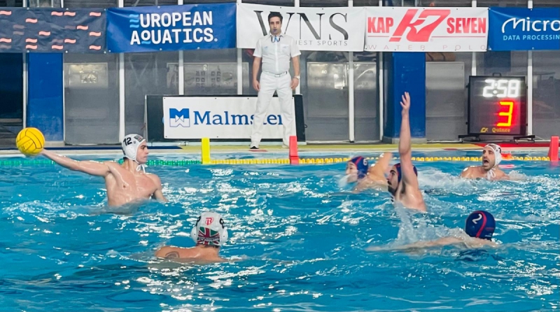 Inizio equilibrato della gara con i greci che sfruttano al meglio le occasioni in superiorità numerica. Buona la reazione della Ranieri Impiantistica che chiude in parità il primo periodo di gioco grazie alle reti di Radovic, Cuccovillo e Rocchino. Si va al primo intervallo sul 3-3