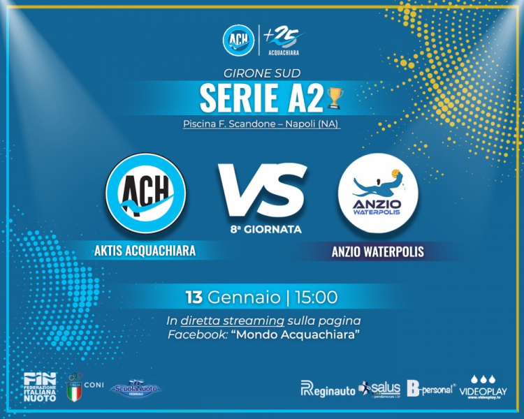 Le ultime partite del 2023 non hanno rispecchiato le brillanti esibizioni dell’avvio di annata ma sono state, senza dubbio, una preziosa lezione di crescita che ha evidenziato i limiti sui quali allenarsi quotidianamente per poter migliorare. Nell’incontro valevole per l’ottava giornata del girone Sud del campionato di serie A2 l’Aktis Acquachiara, nona in classifica con sei punti, riceve alla Scandone, fischio d’inizio previsto domani alle ore 15:00 con diretta streaming sulla pagina Facebook Mondo Acquachiara, l’Anzio Waterpolis, fanalino di coda a quota uno. La squadra ha lavorato intensamente durante le vacanze e non vede l’ora di entrare in acqua per iniziare alla grande il suo 2024. Pensare ad una partita agevole potrebbe essere l’errore più grande per i padroni di casa perché la formazione anziate annovera nel suo roster elementi di assoluto valore che vantano anni di esperienza nella categoria, la sua classifica al momento è bugiarda e la promozione alla guida tecnica di Tullio Apicella ha riportato un minimo di entusiasmo nell’ambiente. Alla vigilia mister Fasano e capitan Ciro Alvino presentano così il primo impegno ufficiale del 2024 biancoazzurro.