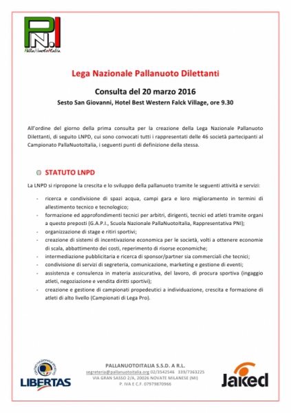 DOMENICA 20 MARZO 2016, dalle ore 9.30 alle ore 11, presso il BEST WESTERN FALCK VILLAGE di Sesto San Giovanni, Viale Italia 958, è in programma la Consulta delle società PallaNuotoItalia per la discussione e la formazione della Lega Nazionale Pallanuoto Dilettanti, organo di rappresentanza pensato dal fondatore di PNI, Alessandro De Tursi, per prendere coscienza e trovare soluzione dei problemi della pallanuoto in Italia.