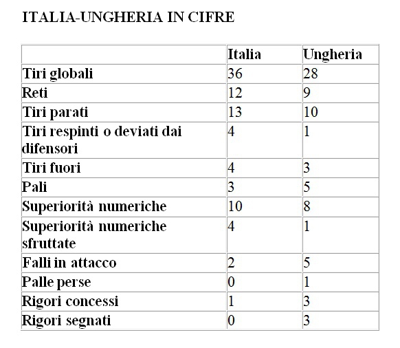 Superiorità numeriche: Italia 4/10 + 1 rigore, Ungheria 1/8 + 3 rigori. Spettatori 1100 circa